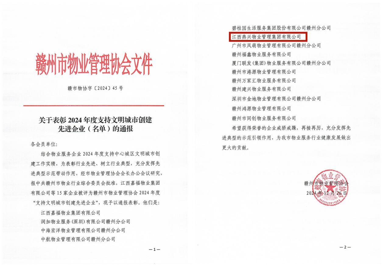 喜報|燕興物業榮獲“2024年度優秀物業企業”“誠信自律企業””支持文明城市創建先進企業”榮譽稱號