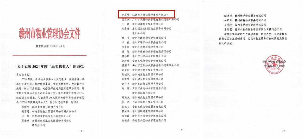 2025年元月7日,贛州市物業管理協會第五屆三次會員大會在贛州市格蘭云天國際酒店勝利召開,會上對2024年度優秀物業企業及個人進行了通報表彰。燕興物業喜獲贛州市“2024年度優秀物業企業”“2024年度誠信自律企業”“2024年度支持文明城市創建先進企業”榮譽稱號;龍南嘉和半島小區復評通過“贛州市優秀示范小區”,項目經理周群蓉喜獲“2024年度優秀物業項目經理”榮譽稱號,公園壹號小區物管員李小梅獲得“最美物業人”榮譽稱號。
