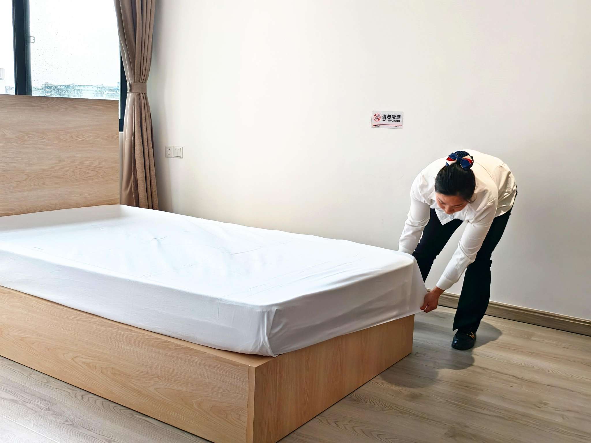 比賽現場,參賽服務員們迅速進入“戰斗”狀態,在緊張而有序的氛圍中大展身手。隨著一聲令下,他們動作嫻熟、一氣呵成:雙手輕揚,潔白的床單如靈動的蝶翼在空中翻飛,轉瞬便平整地鋪展在床上;緊接著,套被套、折被角,每一個步驟都精準到位,盡顯扎實功底。經選手們精心塑造,原本松散的被芯變得棱角分明、挺括有型,將標準化服務流程與藝術美感完美融合。評委們秉持公平公正原則,從操作規范程度、完成效率、細節處理等多個維度進行細致評分,不放過任何一個細節,確保賽事結果真實反映選手水 平。