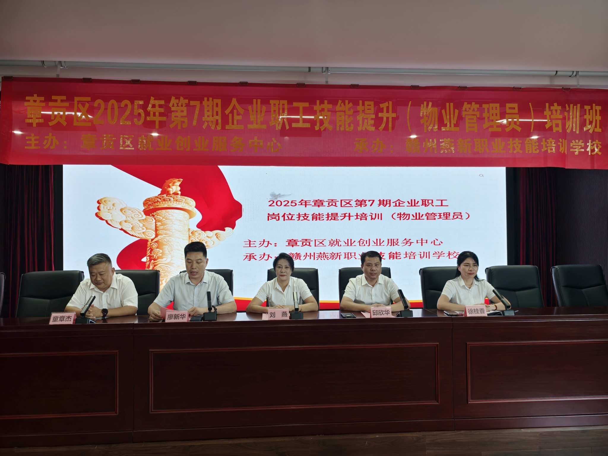 8 月 8 日下午,江西燕興物業(yè)管理集團有限公司第一期物業(yè)管理員企業(yè)在崗職工技能提升培訓開班儀式順利舉行。本次培訓由章貢區(qū)就業(yè)創(chuàng)業(yè)服務(wù)中心主辦、贛州燕新職業(yè)技能培訓學校承辦,旨在全面提升物業(yè)管理人員的專業(yè)素養(yǎng)與實操能力,助力物業(yè)行業(yè)高質(zhì)量發(fā)展。江西燕興物業(yè)管理集團有限公司黨委書記、董事長劉燕,贛州燕新職業(yè)技能培訓學校校長邱欣華,培訓班主要負責人廖新華會長、江西燕興物業(yè)管理集團有限公司常務(wù)副總經(jīng)理徐桂香、副總經(jīng)理童章杰出席開班儀式。